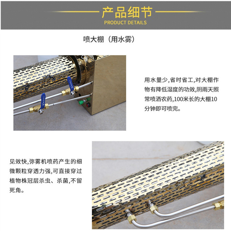 用处:农业雾药机适用于树林,苗圃,果园,茶园的病虫害防治,棉花,甘蔗,葡萄,小麦,稻谷,玉米等。大田农作物和大片草坪,城市和郊区花园预防,操纵花草,菜园和温室中的植物病虫害。