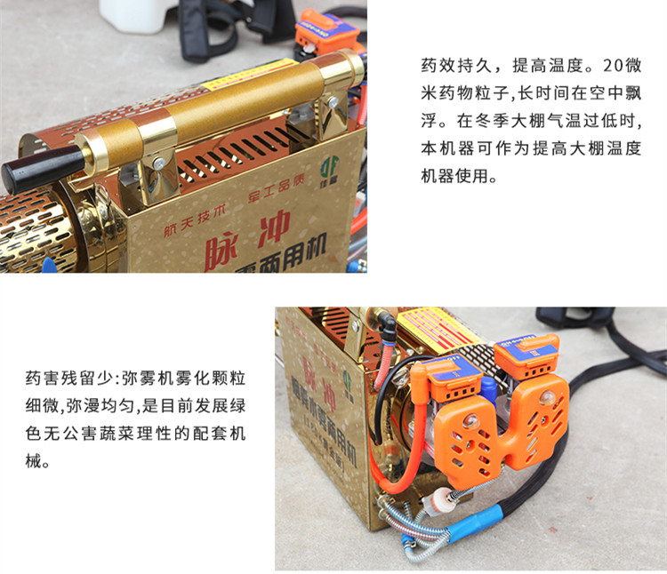 雾药机:一种新型的喷雾,施肥,杀虫,消毒烟雾机,使用脉冲喷射法则设计制造,整机无旋转部件,在任何情形下均无机器磨损,经久耐用该机能使药品变为烟雾,具有极好的渗透和扩散性,附着力好,耐雨水冲洗,操作方便,大大缩减了药品用量,工作效率高,并具有杀菌灭虫的功用。其他突出特征